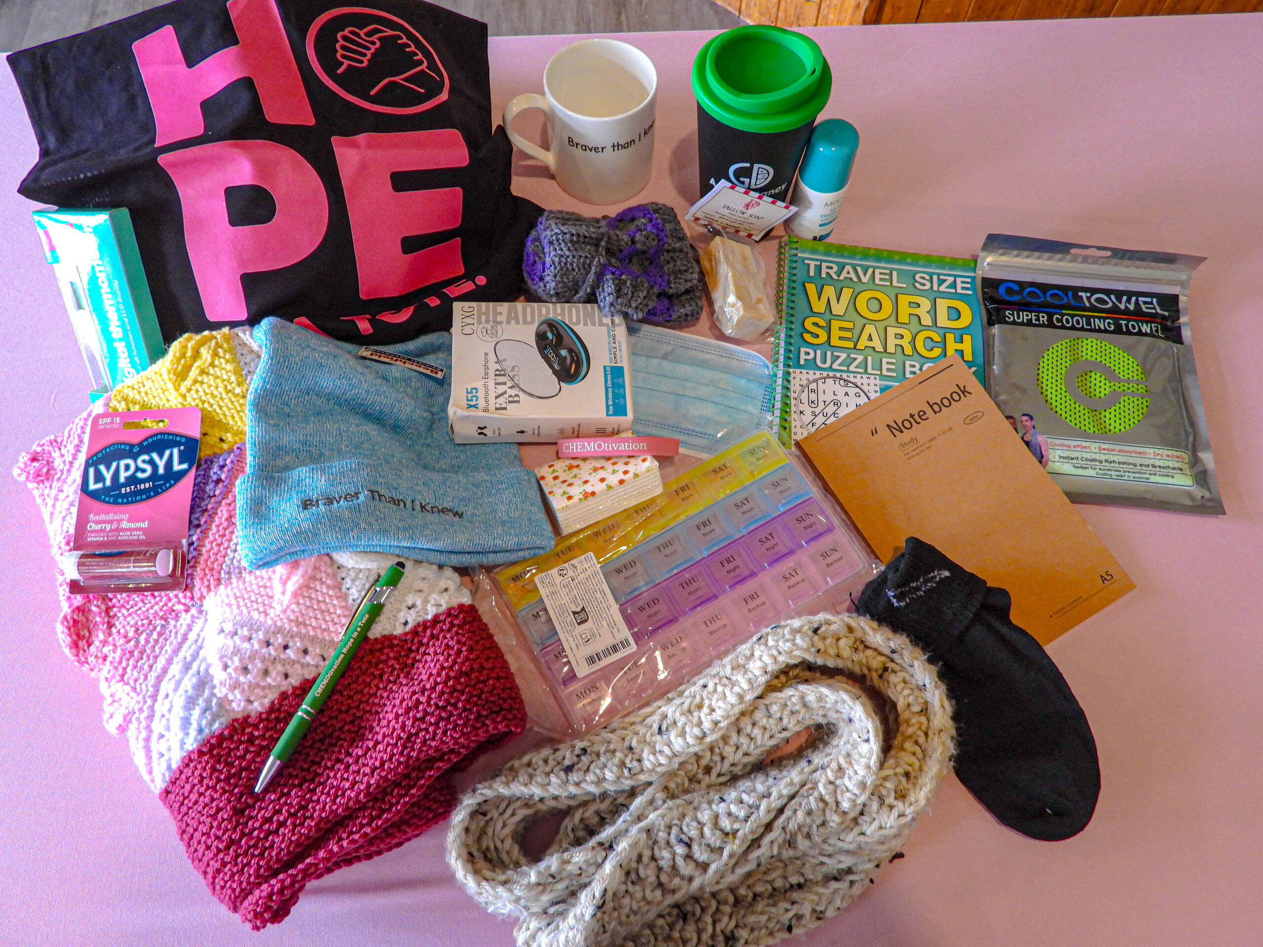 Lots of different items go into each ‘hope in a tote’ bag to support chemotherapy patients through treatment. These contents may vary.